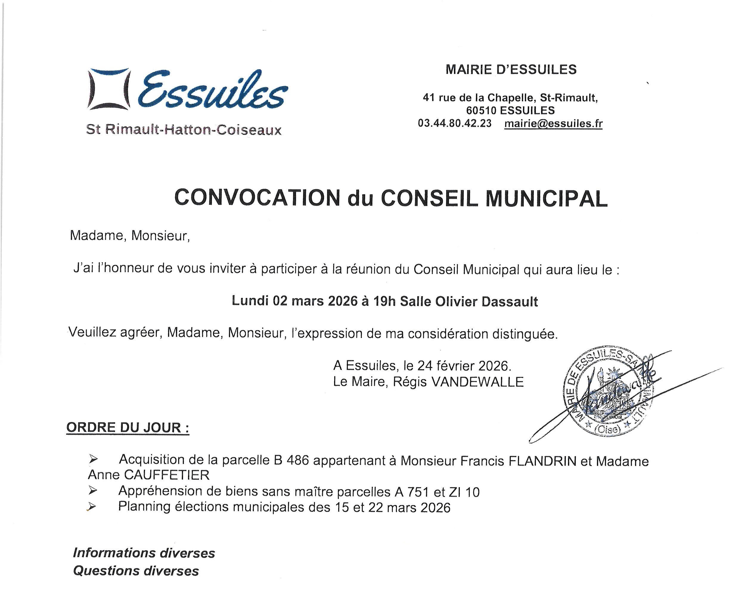 - Par voie postale à l’attention de M. Le Maire d'Essuiles - Mairie d'Essuiles - Rue Chapelle - Hameau de St Rimault - 60510 ESSUILES